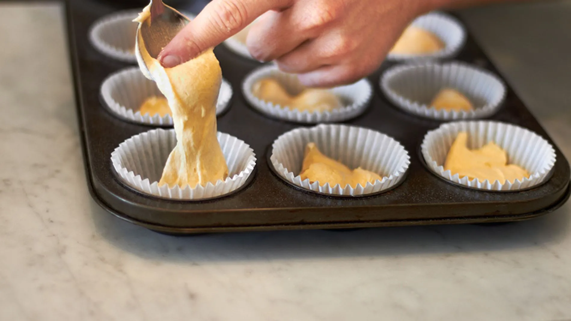 2. Razdelite mešanico na porcijeTesto s pomočjo zajemalke za sladoled razdelite v pekač za mafine, obložen s papirnatimi modelčki. Pecite v pečici 25–30 minut.