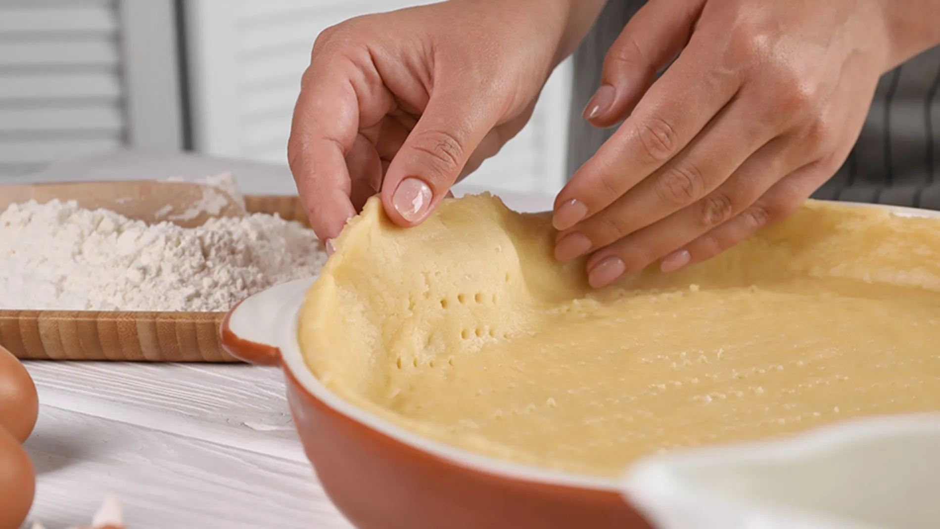 - S testom obložite namaščen pekač, dno večkrat prebodite z vilicami in ga pecite 10 na 180 °C (zgornje/spodnje gretje).