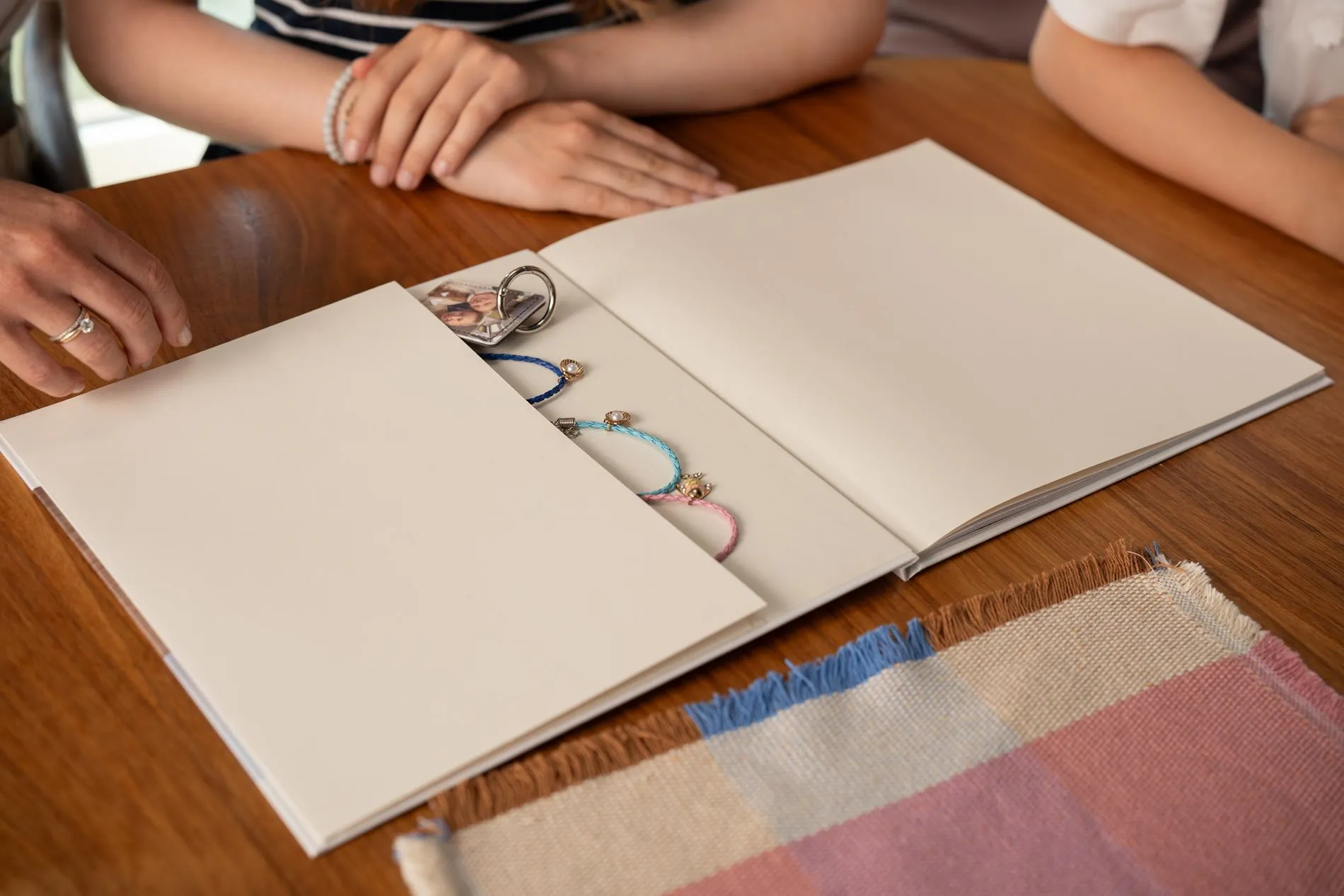 Naša novost je tudi poseben žep za spomine, ki ga lahko najdete na hrbtni strani zadnje platnice vaše CEWE FOTOKNJIGE. Vanj lahko shranite različne tiskovine, kot so vabila, vstopnice s koncertov, prve fotografije ultrazvoka ali drobna darilca. Žep je na voljo pri klasični vezavi fotoknjig, in sicer za vse formate fotoknjig razen za otroško fotoknjigo.