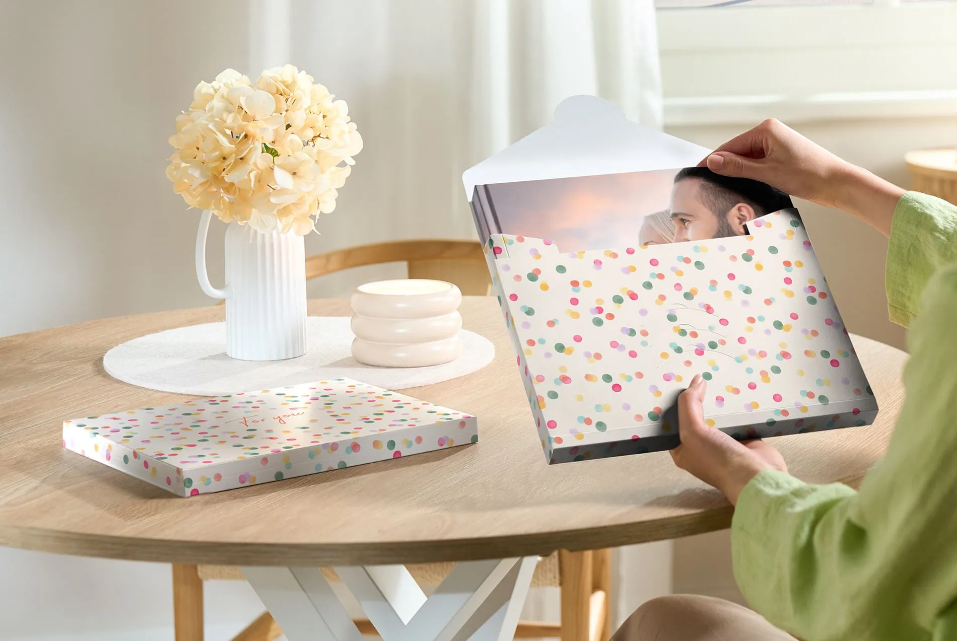 Če bi fotoknjigo želeli podariti, jo lahko zapakirate v darilno embalažo v čudovitem dizajnu konfetov. Elegantna embalaža poskrbi za popoln prvi vtis in naredi trenutek obdarovanja še bolj poseben. Tako bo vaše darilo navdušilo že na prvi pogled.