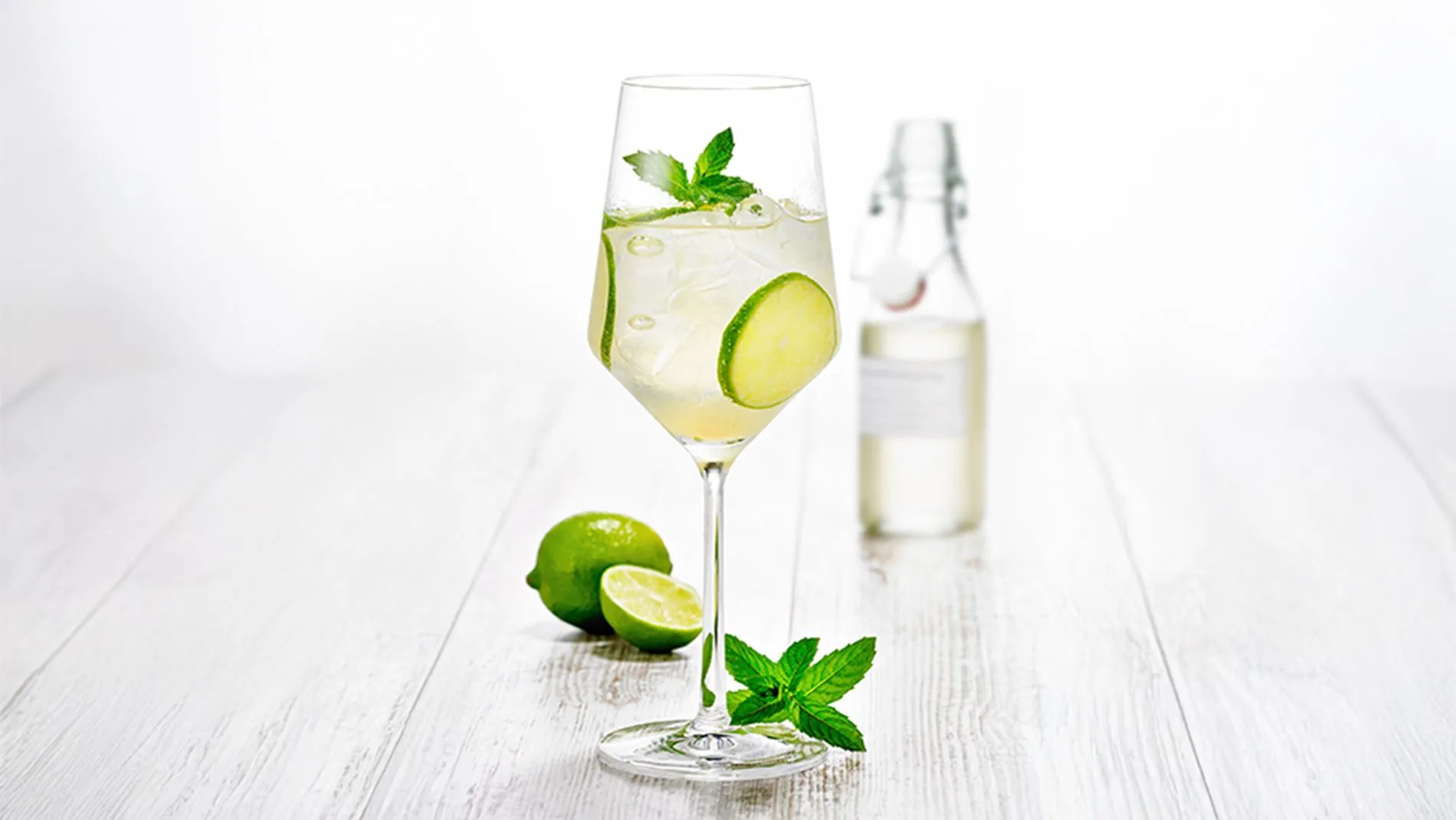 - Limeto operite, jo narežite na rezine in dajte v kozarec skupaj z bezgovim sirupom.