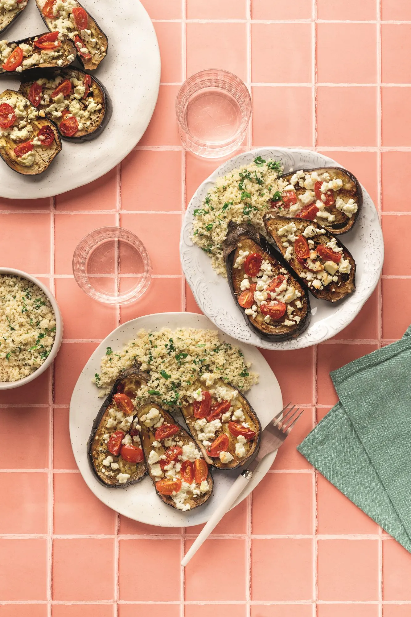 Paradižnik operite in razrežite na četrtine ter jih razporedite po jajčevcih. Feto nadrobite in jo razporedite po jajčevcih. Vse skupaj postavite v pečico za približno 30 minut. Pečene jajčevce postrezite s krompirjem, basmati rižem, polento ali kuskusom.